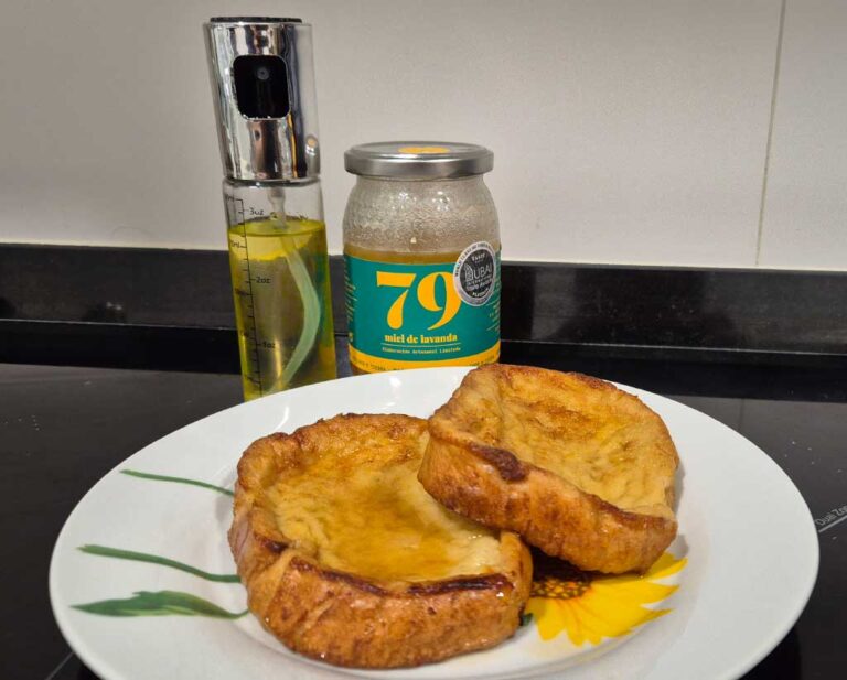 Nosotros hemos bañado las torrijas en miel, pero hay muchas formas de terminarlas, como espolvorearlas con azúcar en grano, bañarlas en almíbar o añadirles algún sirope. Las torrijas en freidora de aire tienen mucho menos aceite, por lo que el azúcar en grano no es la mejor opción, ya que tendrías que añadir un poco de aceite para que se adhiera, y precisamente tratamos de evitar el exceso de grasa.